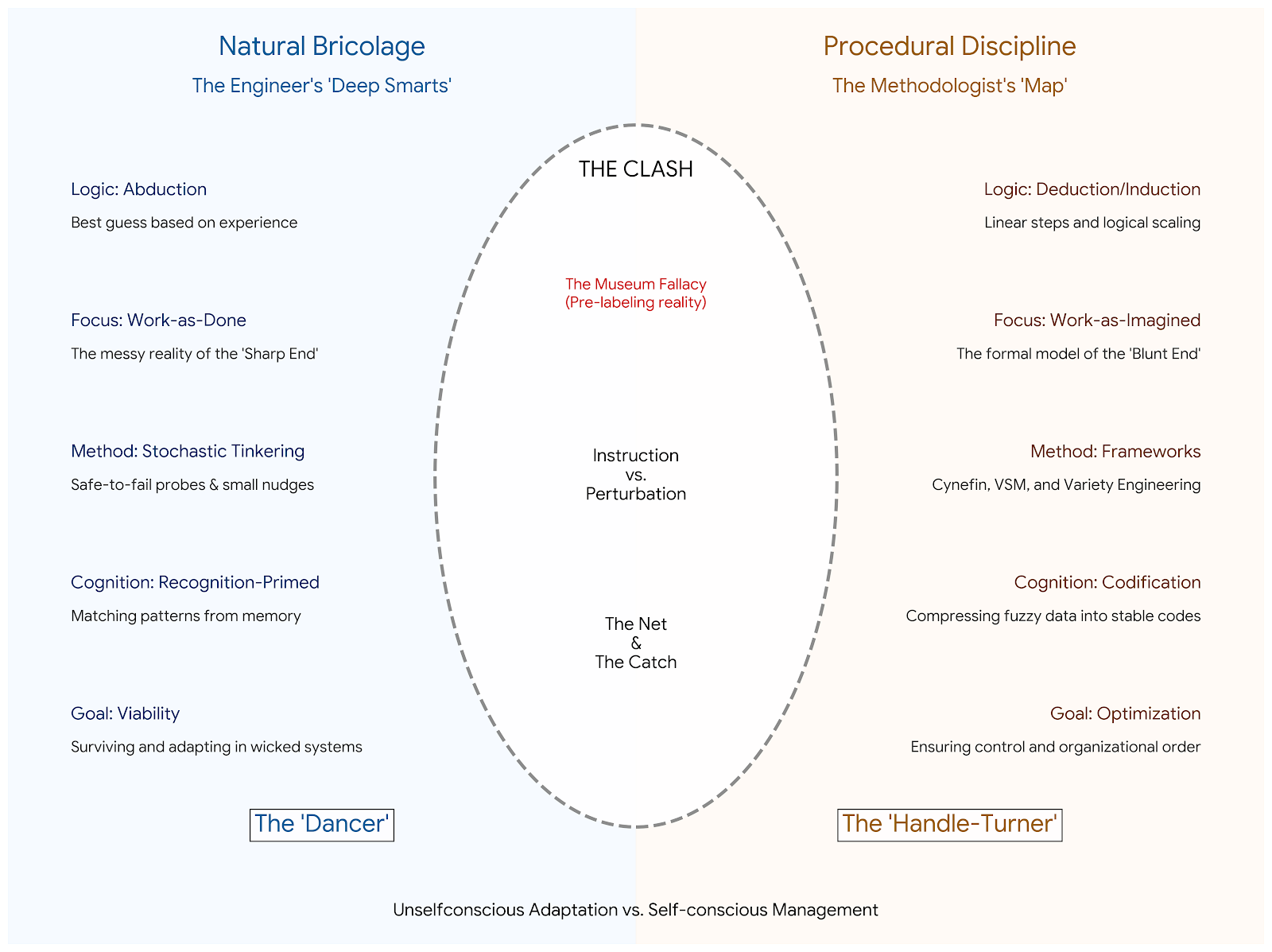 Final Logic: The engineer “dances” within the system, while the methodologist “maps” the dance floor. The visualization shows that while both are necessary for a “viable” organization, they operate on entirely different logic modes.