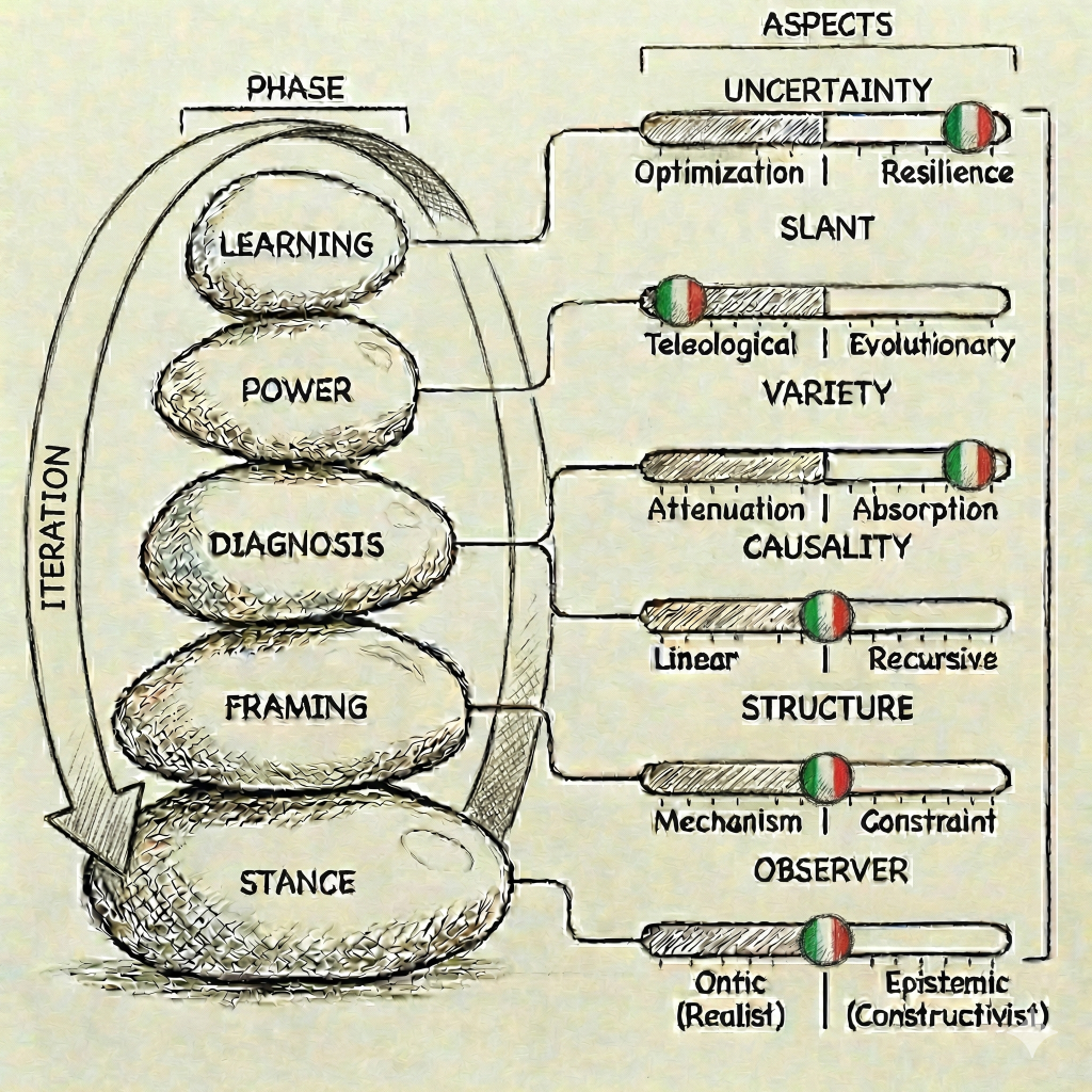 Here the three elements - phase, aspects, polarities - are defined, integrated as a guide and illuminated by the [Italian Flag. The relationship between the elements is illustrated in an interplay diagram or as a clearer image.
