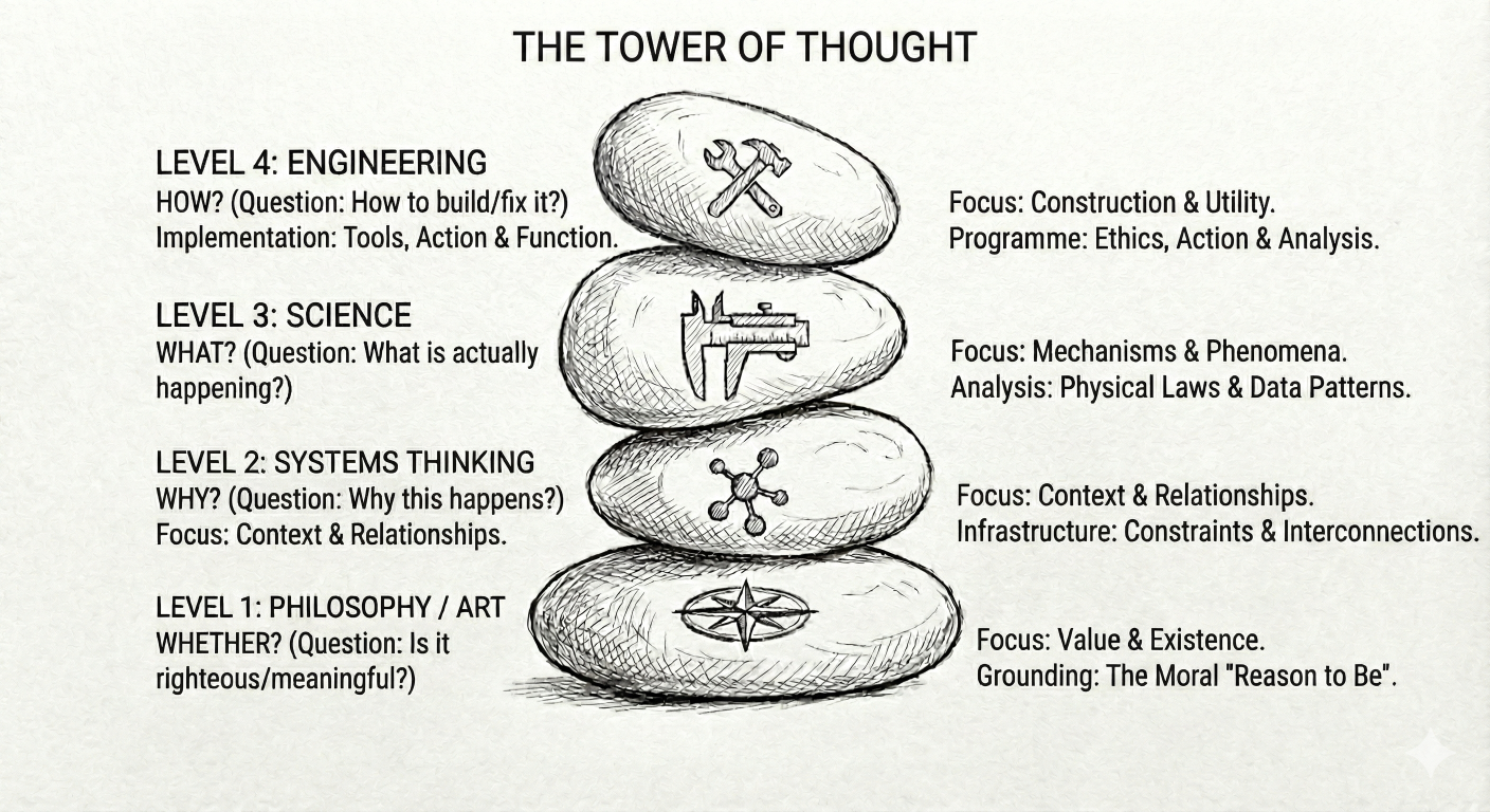 Along the way a ‘Tower of Thought’ was identified which reflects the questioning, the style and the focus of the analyst in exploring situations. This is a contingent positioning where experienced Systems Thinker shift seamlessly between the perspectives.